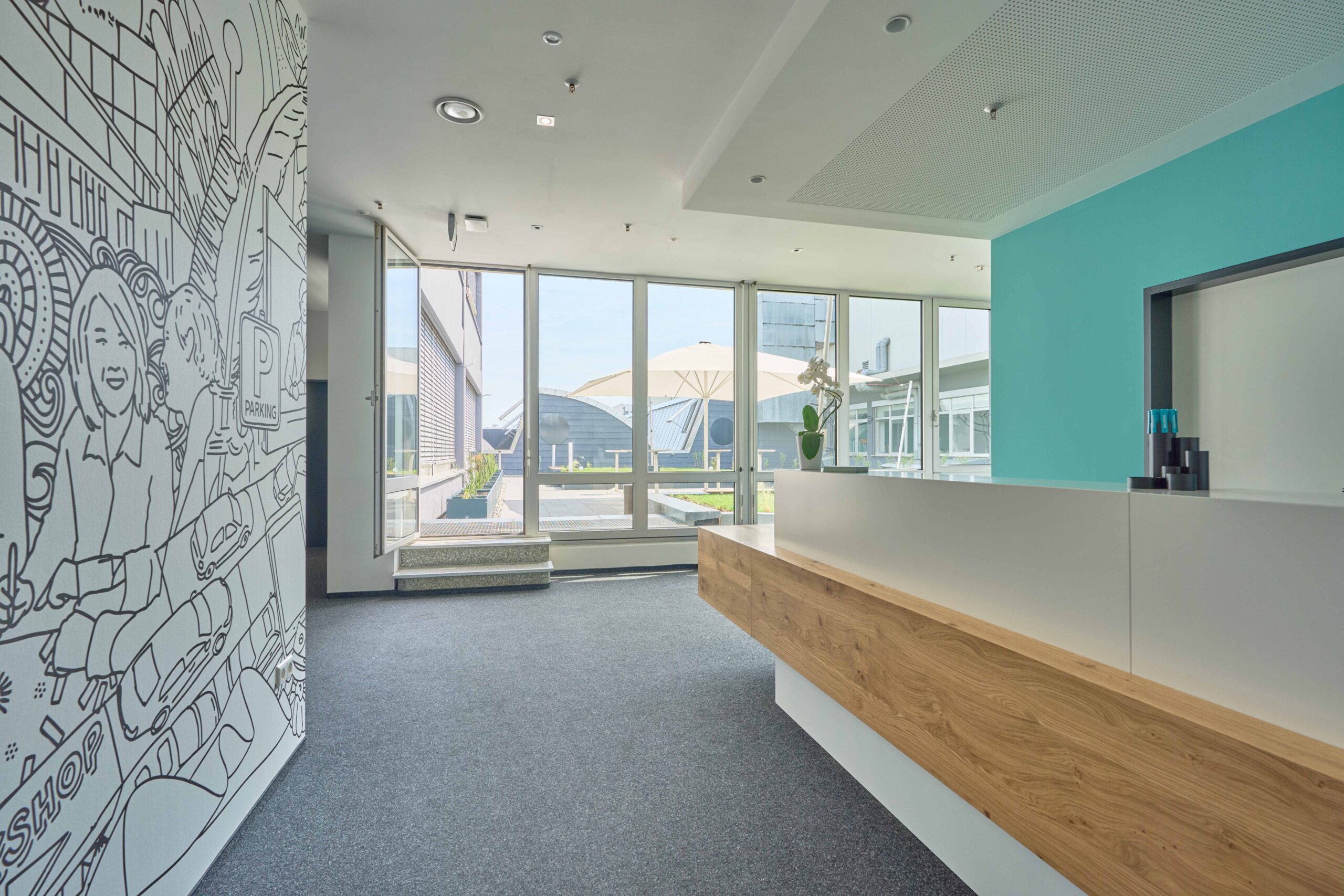 Das Foyer bietet Sitzmöglichkeiten, Wasser und Kaffee für Pausenaufenthalte